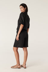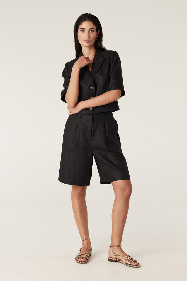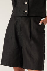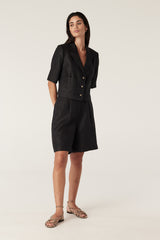 The Elm Linen Short is a classic tailored fit style made from pure French linen twill. Cut to a knee length, it features a front zip with hook and bar closure, side seam pockets and back mock welt pockets. Belt loops at the front and back complete this versatile short. Style with the Elm Linen Blazer.