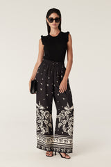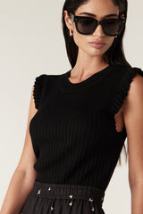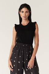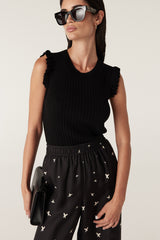 The Silk Tencel Frill Top is a slim fit style in a lightweight rib knit. Knitted from a silk Tencel blend with a soft feel on the skin, it features a crew neckline and delicate frill trim at the shoulders. The rib structure adds subtle texture, making it an easy piece to layer or wear on its own.