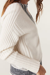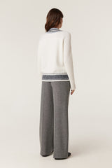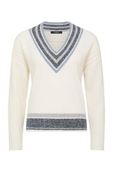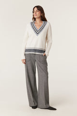 The Cashwool Varsity Jumper is a regular fit, medium-weight knit featuring wide rib detailing along the shoulder, side seams, and sleeves. Designed with a V-neckline, it is finished with a multi-colour contrast stripe trim at the neck and hem.