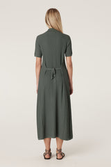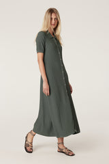 The Brooke Crepe Rib Dress is a regular fit, full-length style crafted from a medium-weight knit. Designed with a classic polo collar and front button placket closure, it features an adjustable back waist tie and is finished with rib trim at the cuffs and hem.