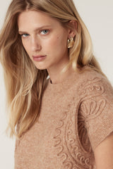The Elena Knit Top is a regular fit, medium-weight knit crafted from a wool mohair blend. Designed with a dropped shoulder and classic crew neckline, it features cornelli embroidery detailing at the front and is finished with rib trim at the neck, armhole, and hem.