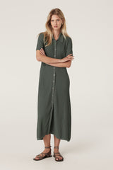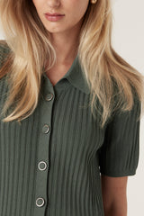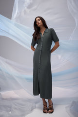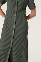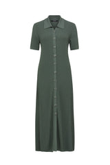 The Brooke Crepe Rib Dress is a regular fit, full-length style crafted from a medium-weight knit. Designed with a classic polo collar and front button placket closure, it features an adjustable back waist tie and is finished with rib trim at the cuffs and hem.