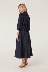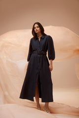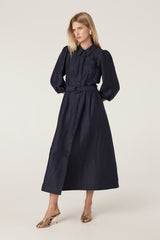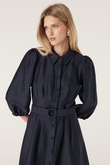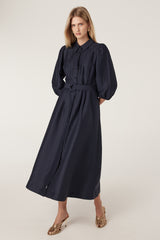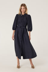 The Manly Dress is a regular fit style featuring a button-through front and blouson sleeves with elasticated cuffs. Designed with pleat detailing at the front waist and elastic at the back, it includes a matching belt with D-ring closure for a softly structured silhouette.