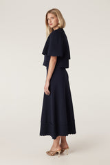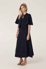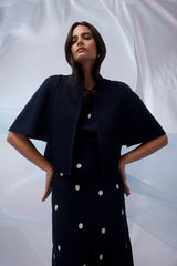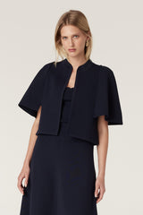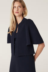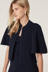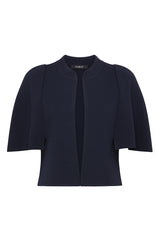 The Villa Crepe Knit Bolero is a regular fit, medium-weight knit designed with a mandarin collar and open front. Featuring a mock cape sleeve, it is finished with self-start cuffs and hem for a refined finish. Style with the Villa Crepe Knit Scallop Skirt and Tank Top.