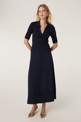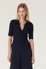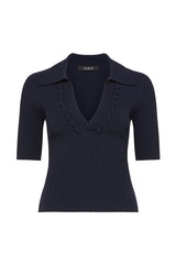 The Villa Crepe Polo Top is a slim fit, medium-weight rib knit style featuring a mesh pointelle polo collar and placket with scallop detailing. Finished with self-start cuffs and hem, it can be worn as a set with the matching Villa Crepe Knit Scallop Skirt.