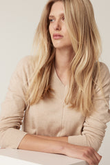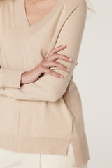 The Cotton Cashmere V Neck Jumper is a regular fit, lightweight knit made from traceable yarn. Designed with raglan sleeves and a V-neckline, it features exposed seam detailing on the front and back, a high-low hemline with side splits, and rib trim throughout.