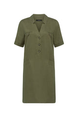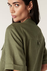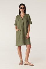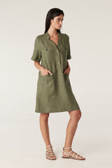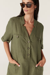 The Sandpiper Linen Dress is a relaxed fit style made from pure French linen. It features a front half button tab, mock chest pockets with button detailing and side pockets. Designed with short sleeves and turn-back cuffs, this dress offers an easy everyday silhouette.