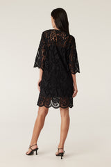 The Shadow Embroidered Dress is a relaxed fit style made from 100% cotton broderie with scalloped hems. It features a V-neckline and comes with a detachable stretch slip for comfort and coverage.
