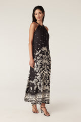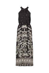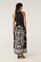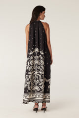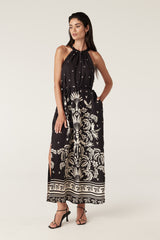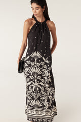 The Temple Halter Neck Dress features an exclusive print with a border hem design and a relaxed fit. Made from a silk blend fabric, it includes a front half placket button closure and a matching fabric tie with tassels.