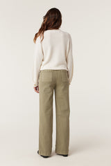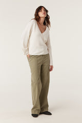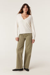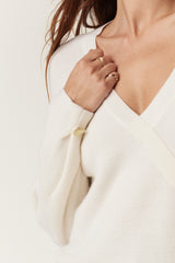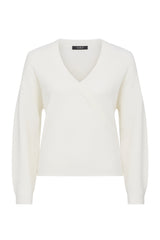 The Audrey Merino Jumper is a regular fit, medium-weight knit. It features a mock wrap front, dropped shoulders, and tuck details at the cuffs with mock buttons. Finished with self-start cuffs and hem.