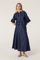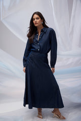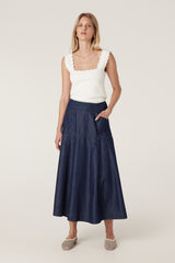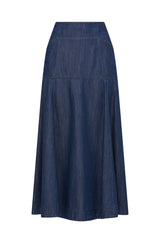 The Bay Skirt is a mid-length style crafted from a medium-weight lyocell blend. Designed with a fitted waist and flared hem, it features front pockets with stitch detailing and a back zip closure. Style with the matching Bay Shirt for a complete set.