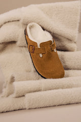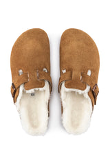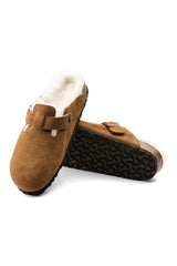 The Birkenstock Boston Shearling Clog is a narrow fit, versatile slip-on style designed for comfort and warmth. Crafted from soft suede, it features an adjustable strap with a burnished buckle and a full shearling lining for a soft feel. Finished with a contoured cork-latex footbed and a lightweight EVA sole for all-day support.