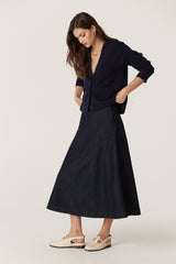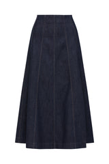 The Burke Denim Skirt features a regular fit, fitted through the waist and flaring through the hem. Designed with gored panels and contrast pick stitching, it is finished with a concealed side zip. Made from true indigo denim.