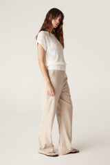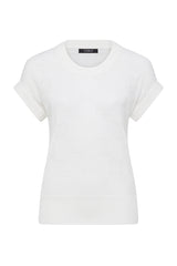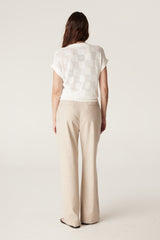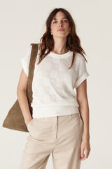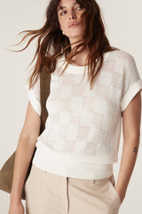 The Checkerboard Knit Top features a regular fit in a lightweight knit, designed with a checkered pointelle stitch throughout the body. It has a classic crew neckline, dropped shoulders, and rib trims at the neck, armholes and hem.