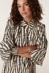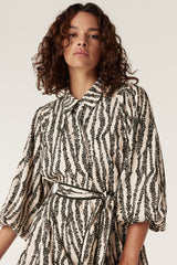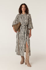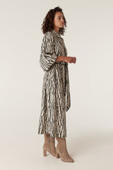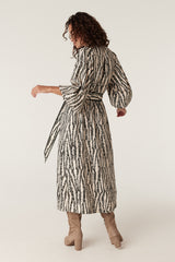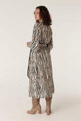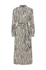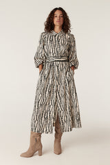 The Colette Dress features a relaxed fit with an exclusive print. Designed with a button through front and natural shell buttons, it falls to a midi length with a softly fluid silhouette. Finished with long sleeves, elasticated cuffs and side pockets, a matching fabric belt allows for a more defined shape.