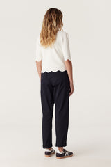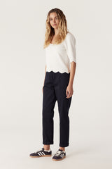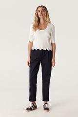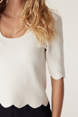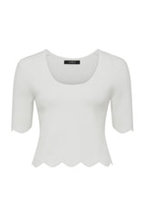 The Crepe Scallop Top is made from medium weight crepe knit. It features a regular fit with a scoop neckline and scallop edges on the sleeve cuffs and hem for a refined finish.