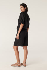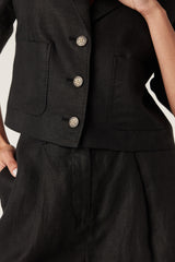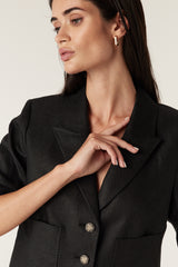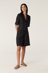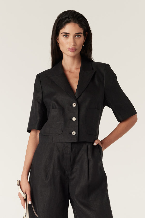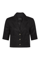 The Elm Linen Blazer is a cropped, tailored fit style made from European pure linen twill. Designed with short sleeves and structured shoulders, it features a button front closure and front patch pockets. Fully lined, this blazer offers a modern take on warm-weather tailoring. Style with the Elm Linen Short.