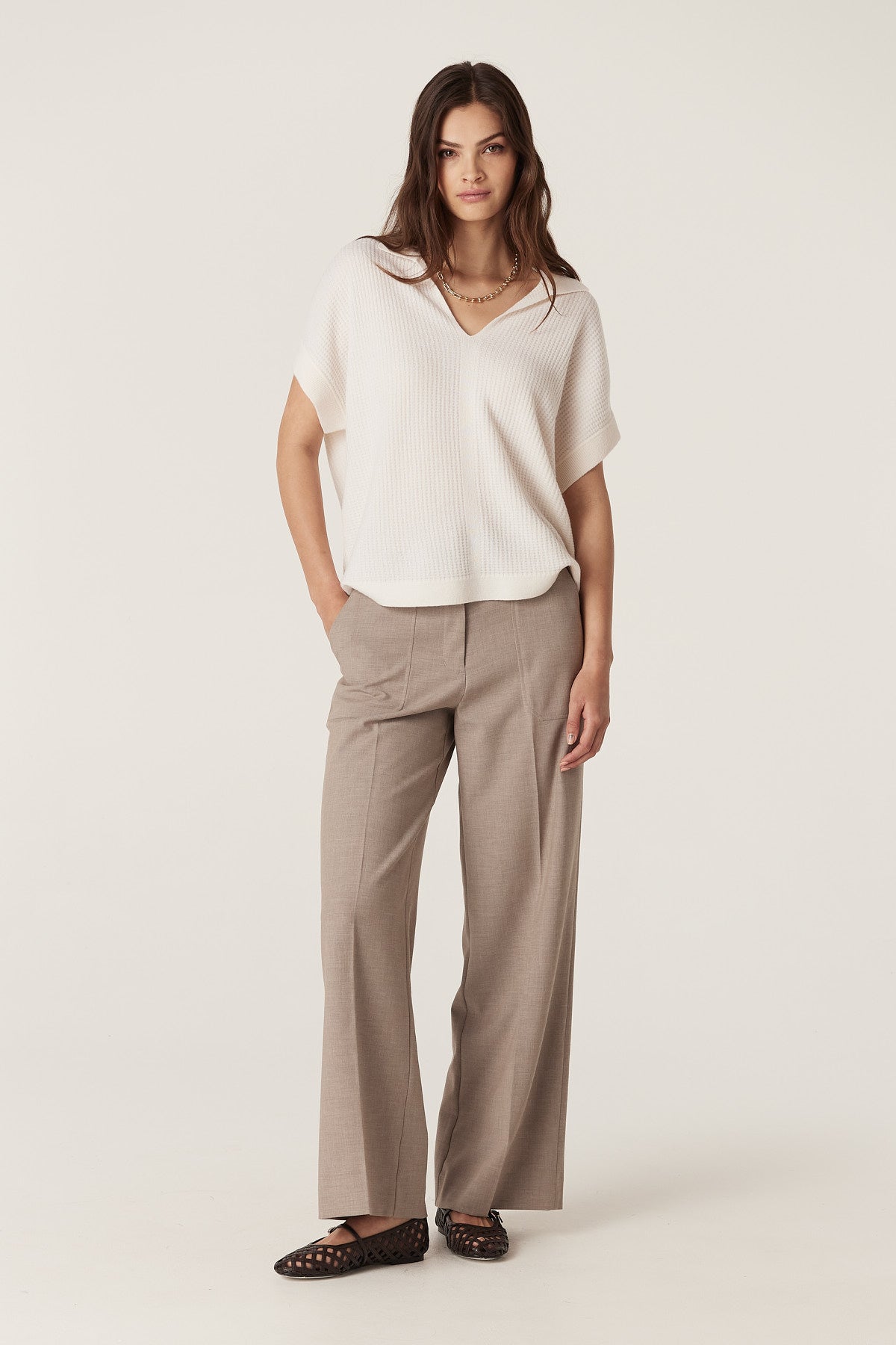 The Evie Wide Leg Pant offers a regular fit with a high fixed waistband and fly front. With front patch pockets, this timeless design is perfect as a smart casual pant for versatile styling.