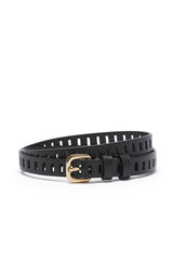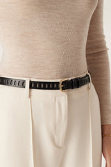 The Fay Leather Belt is crafted from genuine leather with a clean, minimal finish. Designed with multiple eyelets for adjustable sizing, it is finished with gold hardware for a refined touch.