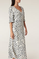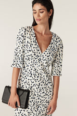 The Haze Dress features a flattering bias cut that drapes softly over the body. Designed with a V-neckline, elasticated cuffs and an invisible side zip, it’s finished in a textured satin-back fabric showcasing an exclusive print.