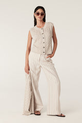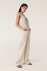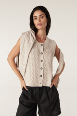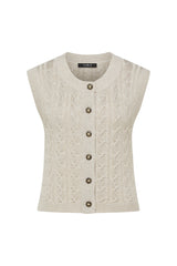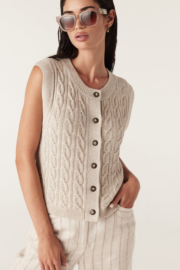 The Lumen Cable Vest is a regular fit style in a medium weight knit. Made from a sustainable yarn with a metallic thread for a subtle shimmer, it showcases an all-over cable stitch with a classic crew neckline and centre front button closure.