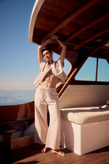 The Marrakesh Linen Pant is a wide leg style with a relaxed fit and elasticated waist. These comfortable pants are made from a textured herringbone Linen Cotton blend. Wear with the matching Marrakesh Linen Jacket.