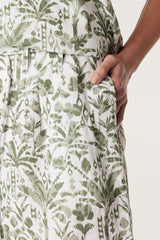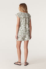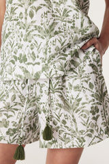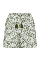 The Oasis Linen Short offers a relaxed fit with a high waist, featuring front tucks, side pockets, and a back zip. Crafted from pure linen in an exclusive print, it comes with a matching fabric tie detailed with beaded tassels.