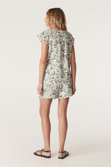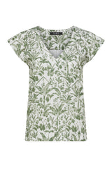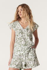 The Oasis Linen Top offers a relaxed fit with a V-neck and flutter sleeves. It features shirring on the shoulders and back yoke, made from pure linen with an exclusive print. For a coordinated look wear with the Oasis Linen Short.