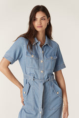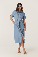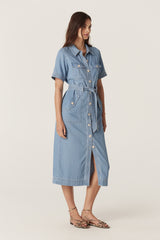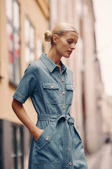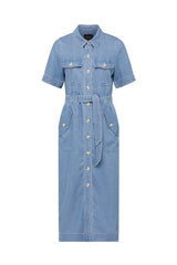 The Pearce Dress is designed in a regular fit from a lyocell cotton blend. Featuring a button through front and short sleeves, it is detailed with utility style pockets and contrast stitching throughout. Finished with a matching waist tie.
