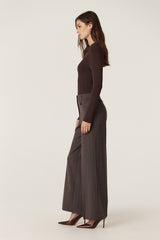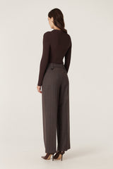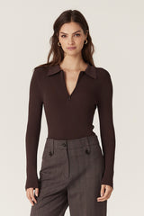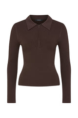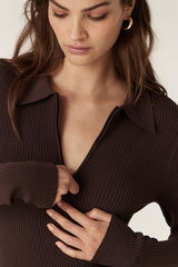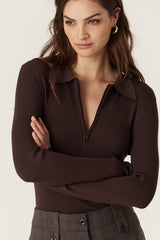 Rib Knit Polo Zip Top - Chocolate