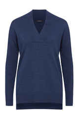 The Sara Merino Jumper features a regular fit in a lightweight knit with a deep ribbed V shawl neckline. It is detailed with dropped shoulders, full-length ribbed sleeves, mock buttons at the cuffs, and a high-low hemline.