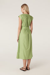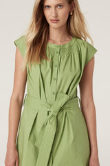 The Verdi Dress is crafted from 100% cotton poplin. Designed in a regular fit, it features a button-through front and a round neckline with shirring detail, complemented by an elastic shirring panel at the back waist. A matching belt with stitching detail and side pockets complete the style.